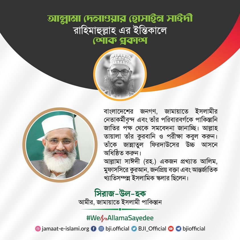 আল্লামা সাঈদী রহ.-এর শাহাদাতে ‘পাকিস্তান জামায়াতের আমীর সিরাজ উল হক’-এর শোক প্রকাশ।