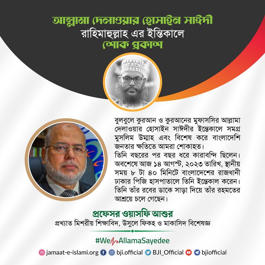 আল্লামা সাঈদী রহ.-এর শাহাদাতে ‘আন্তজাতিক ব্যক্তিত্ব ও সংগঠনের শোক’-এর শোক প্রকাশ।