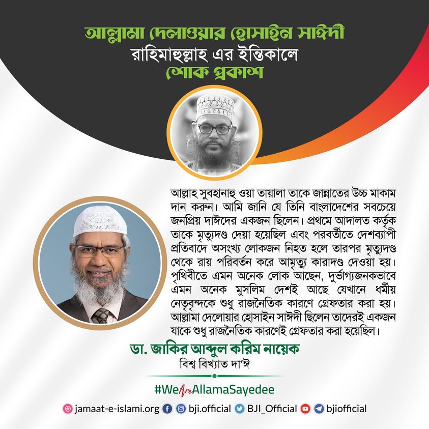 আল্লামা সাঈদী রহ.-এর শাহাদাতে বিশ্ব বিখ্যাত দাঈ ‘ডা. জাকির আব্দুল করিম নায়েক’-এর শোক প্রকাশ।