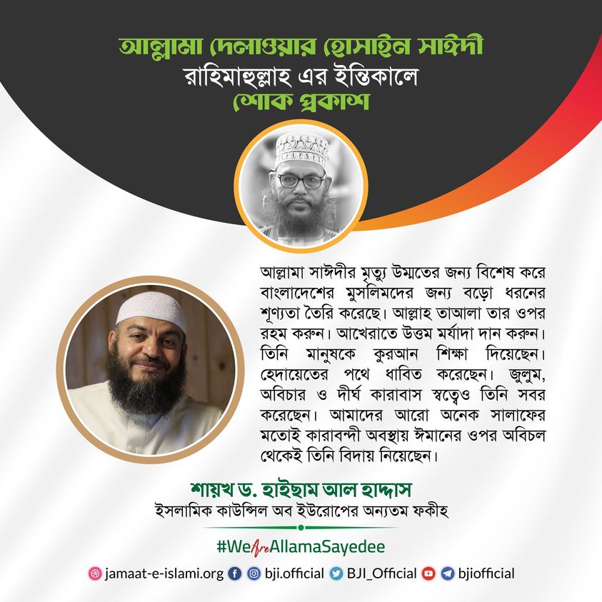 আল্লামা সাঈদী রহ.-এর শাহাদাতে অন্যতম ফকীহ ‘শায়খ ড. হাইছাম আল হাদ্দাস’-এর শোক প্রকাশ।