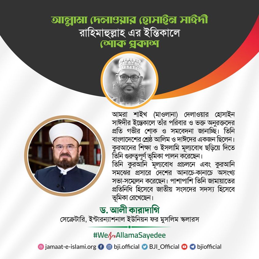 আল্লামা সাঈদী রহ.-এর শাহাদাতে ইন্টারন্যাশনাল ইউনিয়ন ফর মুসলিম স্কলার্স সেক্রেটারী ‘ড. আলী কারাদাগি’-এর শোক প্রকাশ।