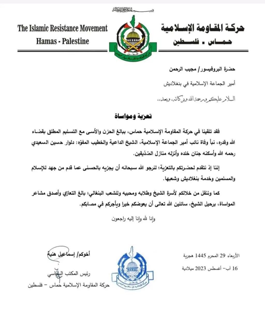 আল্লামা সাঈদী রহ.-এর শাহাদাতে হামাস নেতা ’ইসমাইল হানিয়ার’-এর শোক প্রকাশ।