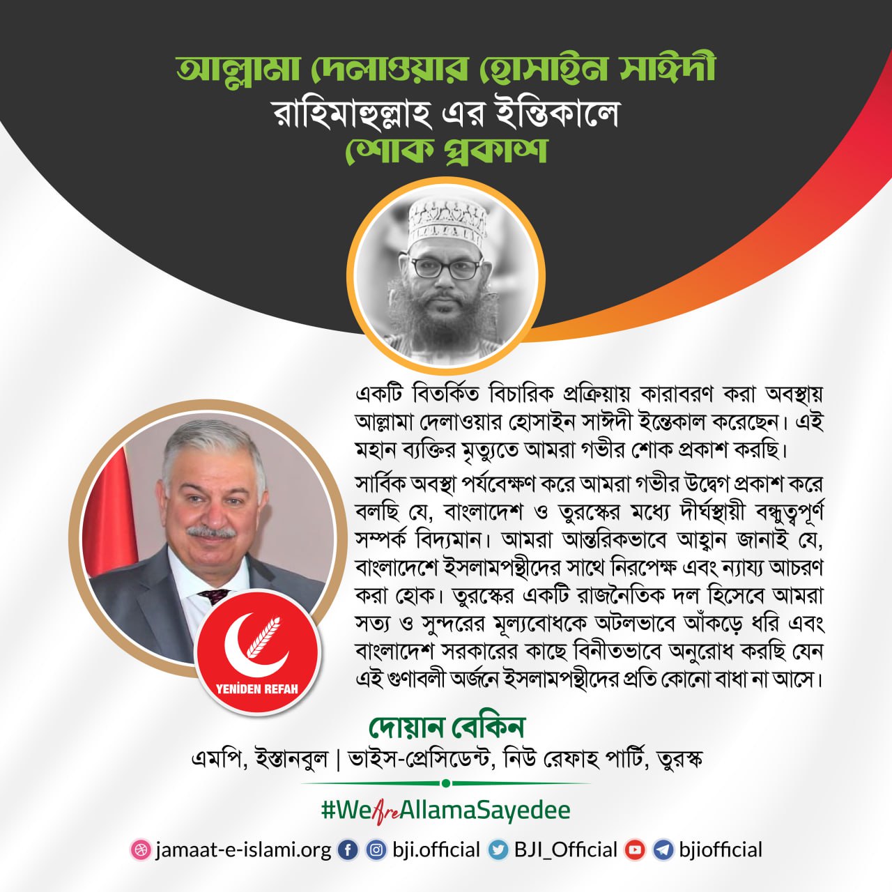 আল্লামা সাঈদী রহ.-এর শাহাদাতে তুরস্কের নিউ রেফার পার্টির ভাইস প্রেসিডেন্ট ‘দোয়ান বেকিন’-এর শোক প্রকাশ।